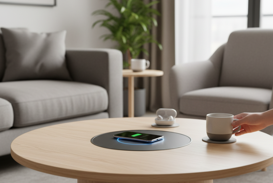 Imagine sipping your morning coffee while your phone wirelessly charges right on your sleek coffee table.