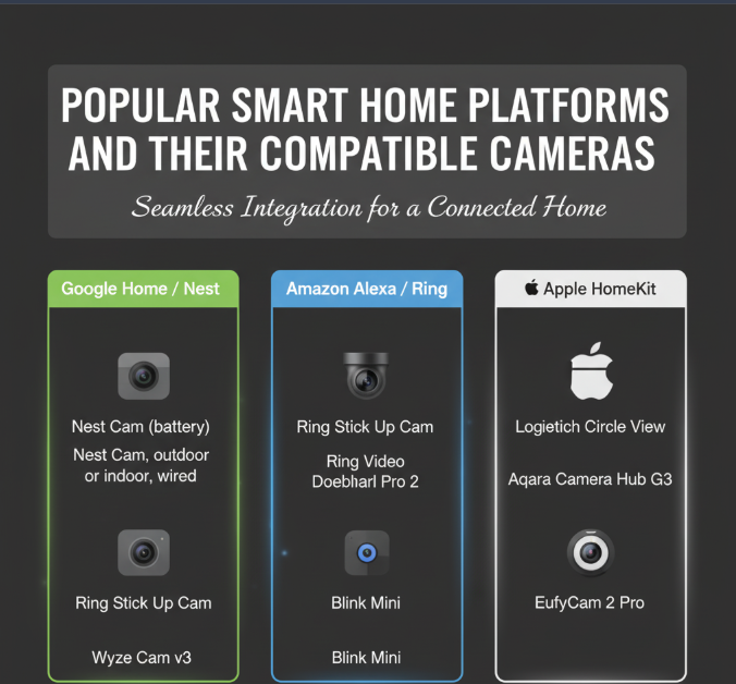 When choosing cameras for your smart home, compatibility with popular platforms like SmartThings, Amazon Alexa, and Google Home is key.